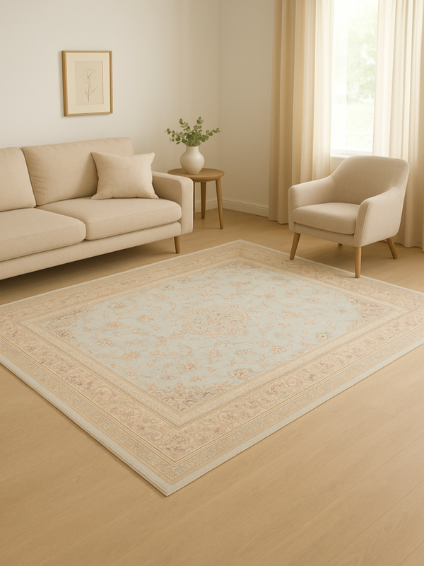 This piece in 7×10 ft (2×3 m) is well-suited for living rooms, dining areas, and larger spaces where a statement rug is desired. The delicate floral layout brings brightness and visual space to the room, while the silver tone adds a calm, luxurious touch.