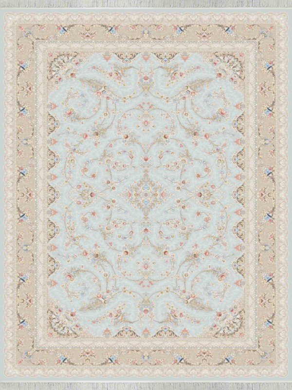 The “Afsan Saba” Persian rug is a 1200-shaneh, high-density carpet designed with an elegant silver Afshan (scattered floral) pattern. Woven from high-quality acrylic fibers, it offers a soft feel underfoot, long-lasting durability, and a refined traditional look ideal for modern or classic interiors.